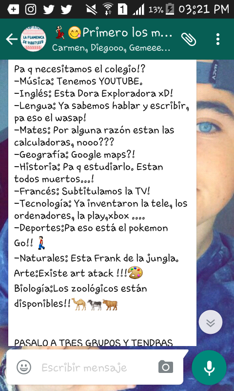 Buenas, soy Emilio Calatayud. Tanto hablar de Internet tiene estas cosas, que los niños se hartan de uno y te contestan. Lo que veis aquí arriba me lo ha mandado la hija de un buen amigo. La niña tiene doce años y, hombre, algo de razón lleva. Y un poquito de cara también tiene, ja, ja, ja. Los niños se preguntan «‘¿Pa’ ‘q’ necesitamos el colegio si tenemos Youtube, Google Maps, calculadoras y a Frank de la Jungla?». Pues necesitamos el ‘cole’ para socializarnos, para convivir con otras personas, para aprender de ellas, para reírnos o llorar juntos, para ayudarnos, para ser solidarios, para crecer y madurar… Y encima no hay que preocuparse de que se descargue la batería.