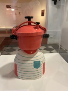 En otra de las salas, las piezas finalistas y ganadoras del XXV Premio Fundación Unicaja de Artesanía. Hay creaciones más convencionales y otras de lo más singular, curioso y provocador. Me encantaron unos mocasines muy locos y mi pieza favorita: ‘Niño olla’, de Chiqui Chicano, realizada en una inenarrable técnica tradicional de churros y modelado.