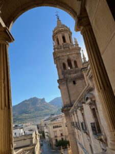 Y así fue como, al fondo de otra calle estrecha, aparece la segunda torre. Y cuando llegamos al final para desembocar en la plaza de Santa María, ese amor a primera vista. ¡Qué maravilla! ¡Qué fachada! ¡Qué joya! ¡Qué preciosidad! ¡Qué simetría y elegancia! ¡Qué estatuaria! ¡Y esa balconada! Lo decía mi amigo Luis G. Chacón: “La de Jaén es una de las grandes catedrales de España. Lamentablemente, muy desconocida”.