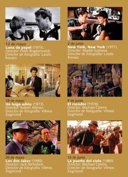 El color, la textura, los matices, la luz, las sombras, los claroscuros… todo el aspecto puramente visual de una película depende del director de fotografía y, como homenaje a esta figura, tan importante como discreta, AulaCine CajaGRANADA organiza un ciclo de seis películas en las que dos de los mejores directores de fotografía de la historia, Vilmos Zsigmond y László Kovács son los grandes protagonistas. Dos cineastas húngaros que tuvieron que huir de la represión soviética y que, en Hollywood, encontraron la tierra prometida para su pasión por el cine y la fotografía.