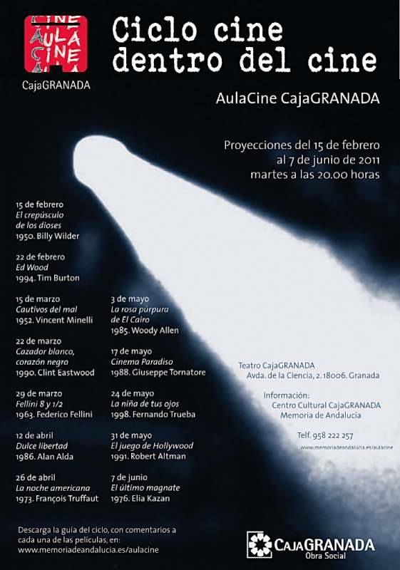 AulaCine CajaGranada presenta, el primer semestre de 2011, un ciclo muy especial: “Cine dentro del Cine”, a través del que queremos mostrar cómo los cineastas han reflexionado sobre su propio oficio, desde un punto de vista tanto artístico como industrial y comercial.