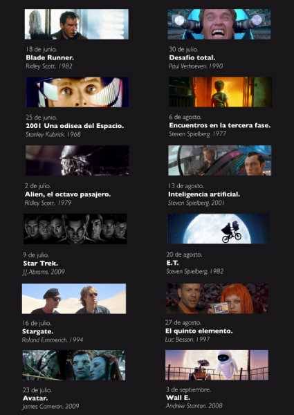 Tras el clásico de anticipación, dirigido por Ridley Scott, siguen otros títulos imperecederos del cine de ciencia ficción, como “2001 Una odisea del espacio”, cuyo enigmático monolito tantos litros de tinta ha hecho derramar; “Alien, el octavo pasajero”, comienzo de una saga que aún sigue vigente o los orígenes de la saga de “Star Trek”, en la versión de JJ Abrams.