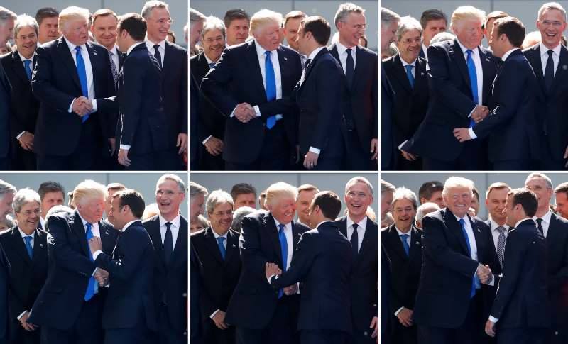 A combination of pictures shows NATO member leaders including U.S. President Donald Trump who shakes hands with French President Emmanuel Macron as they pose for a family picture before the start of their summit in Brussels
