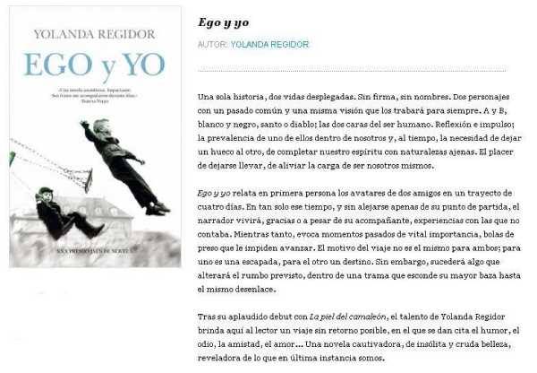 Aun así, no me lo pensé a la hora de empezar a leer la novela de Yolanda Regidor: había escuchado tantas cosas, y tan buenas, sobre “Ego y yo”, que ardía por disfrutar de su lectura. Y eso es peligroso: cuando tienes unas expectativas demasiado altas en algo o en alguien (un libro, un disco, una obra de arte, una persona, un partido político, un equipo de baloncesto…) el riesgo de quedar decepcionado, cuando no, de pegarte un batacazo; es muy alto.