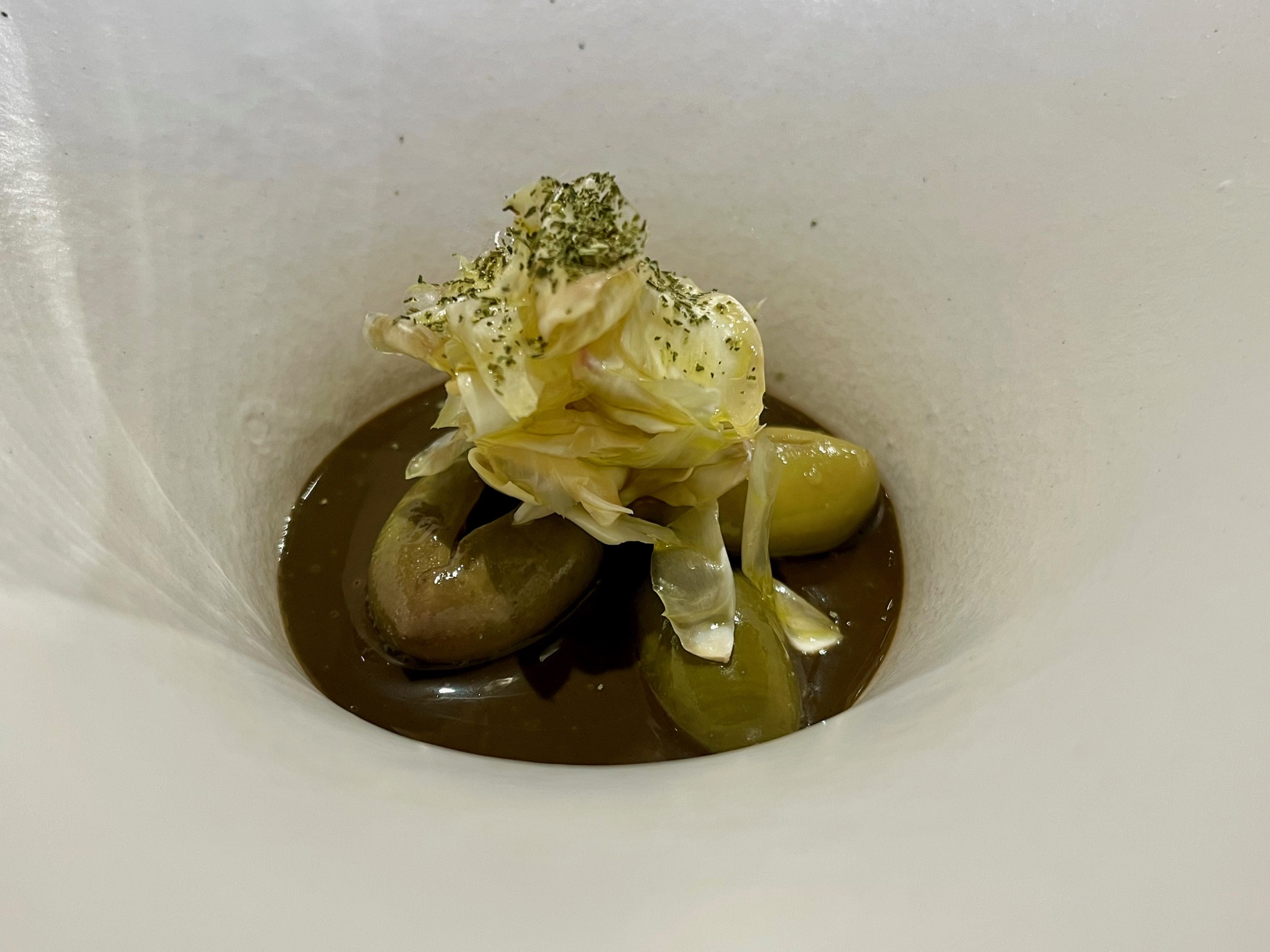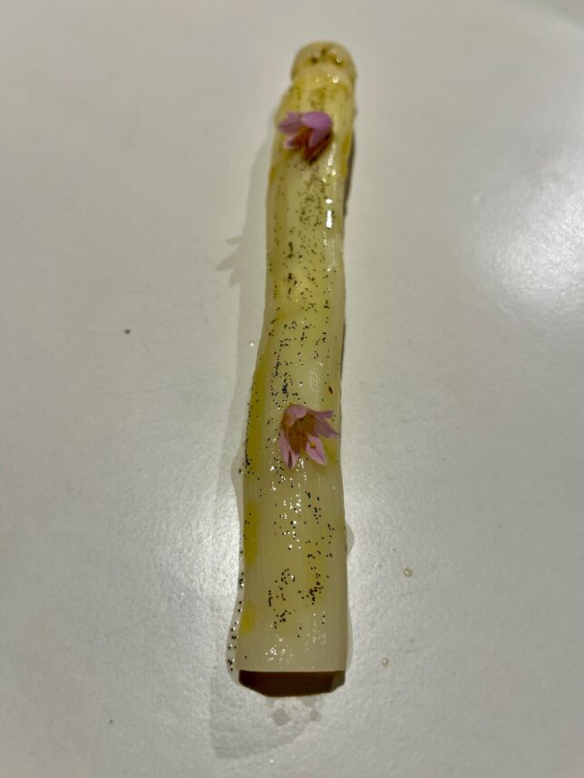 No les voy a detallar todo el menú degustación, faltaría más, que la sorpresa es parte esencial de visitas como ésta y las palabras nunca le pueden hacer justicia a platazos como los protagonizados por el espárrago con la esencia de la piparra y vainilla, por ejemplo, uno de mis favoritos. Sí quiero destacar el primero de los entrantes, Alcachofa y aceituna, que es puro Jaén 100%, como explicaba Juan Carlos, al que gusta acercarse a las mesas y detallar algunas de sus elaboraciones, además de conversar con la clientela para conocer sus percepciones, sus sensaciones, en caliente y de primera mano, colaborando con su excepcional equipo de sala.