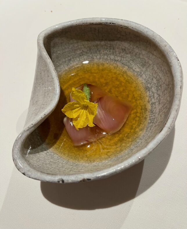 Otra gozada de plato que condensa siglos de tradición gastronómica: Bonito con pipirrana. La pipirrana es una de las recetas clásicas de Jaén y Juan Carlos la destila hasta extraer su quintaesencia, que se disfruta cucharada a cucharada y llenándote la boca de sabor. ¡Hasta la última gota!