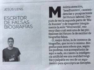 O, mejor dicho, la de inventor de biografías, que no es lo mismo. Biografías para esos robots que, según los profetas, nos acompañarán de aquí a nada, en cuanto la inteligencia artificial sea una realidad tangible y palpable en vez de un argumento para apocalípticas distopías de ciencia ficción.