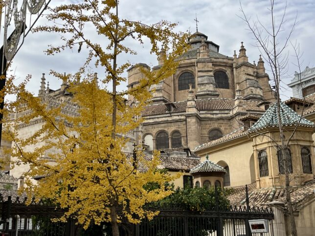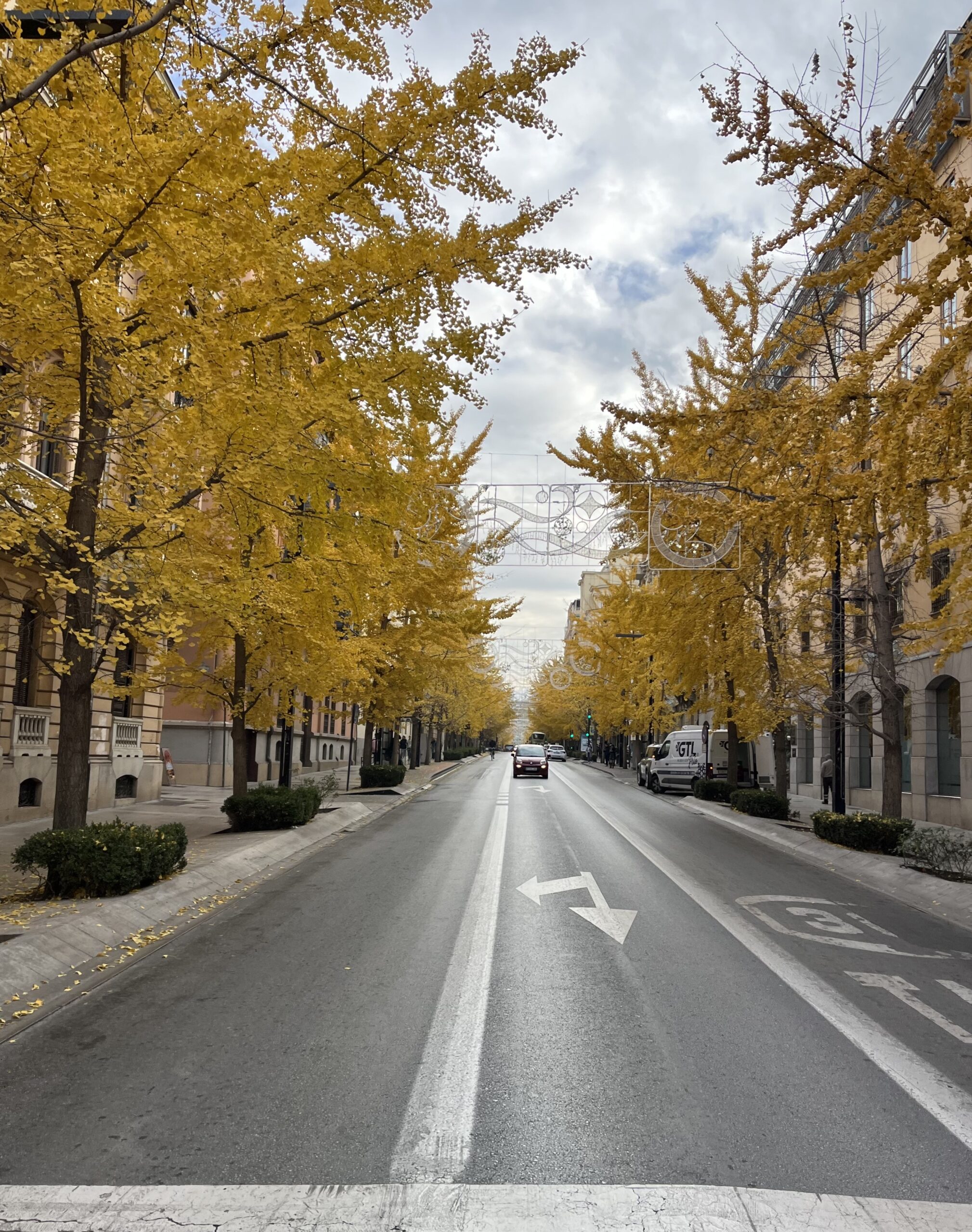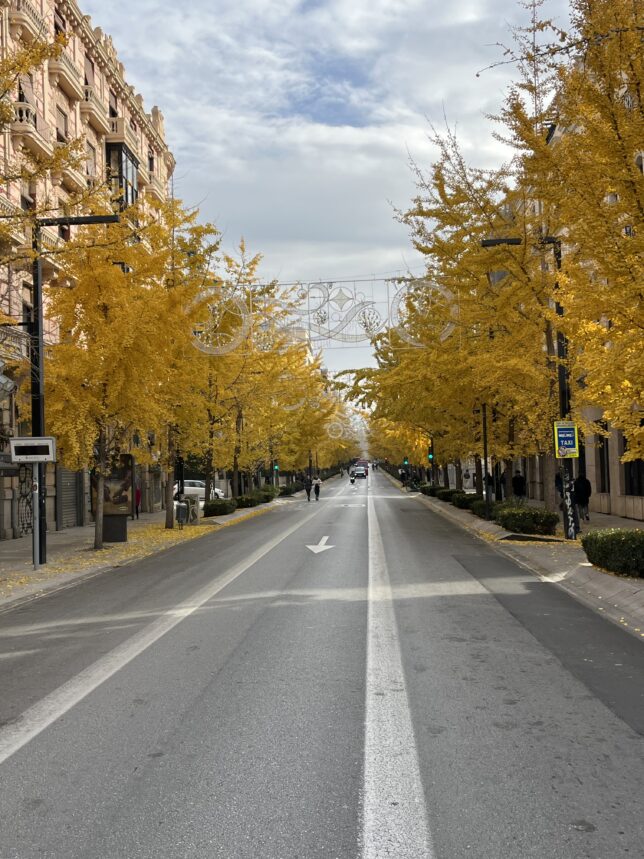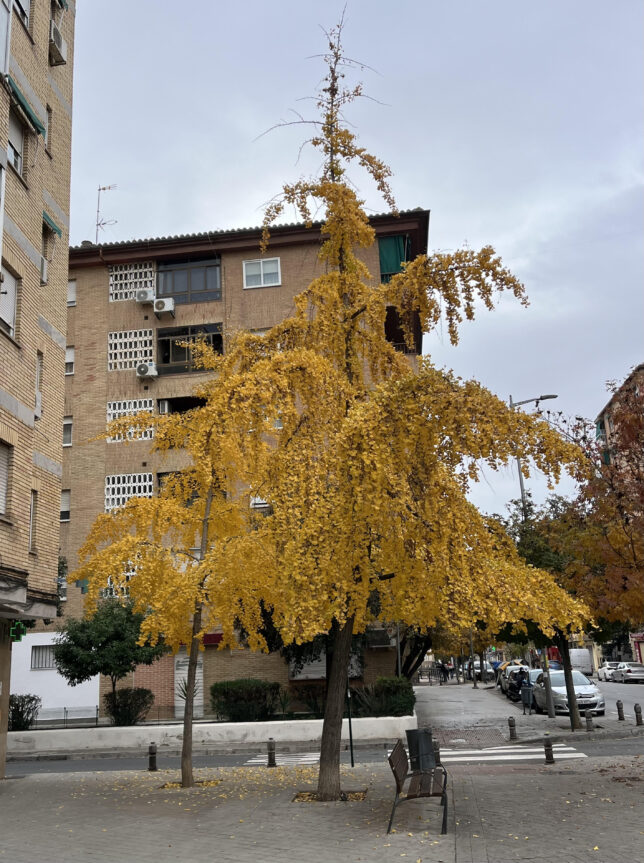 La Gran Vía, ustedes ya lo saben, está ahora reventona gracias al amarillo subido de los Ginkgo biloba, esos fósiles vivientes que, en forma de árbol, son un desafío para la eternidad. Me flipa pasear por allí y deleitarme en toda una explosión de color. Sobre todo en domingo, cuando el tráfico es menos denso, resulta toda una experiencia que les recomiendo vivamente. En el Zaidín también tenemos algunos, con forma de árboles danzantes, pero ver la Gran Vía teñida de amarillo cuan larga es resulta muy bello y evocador.
