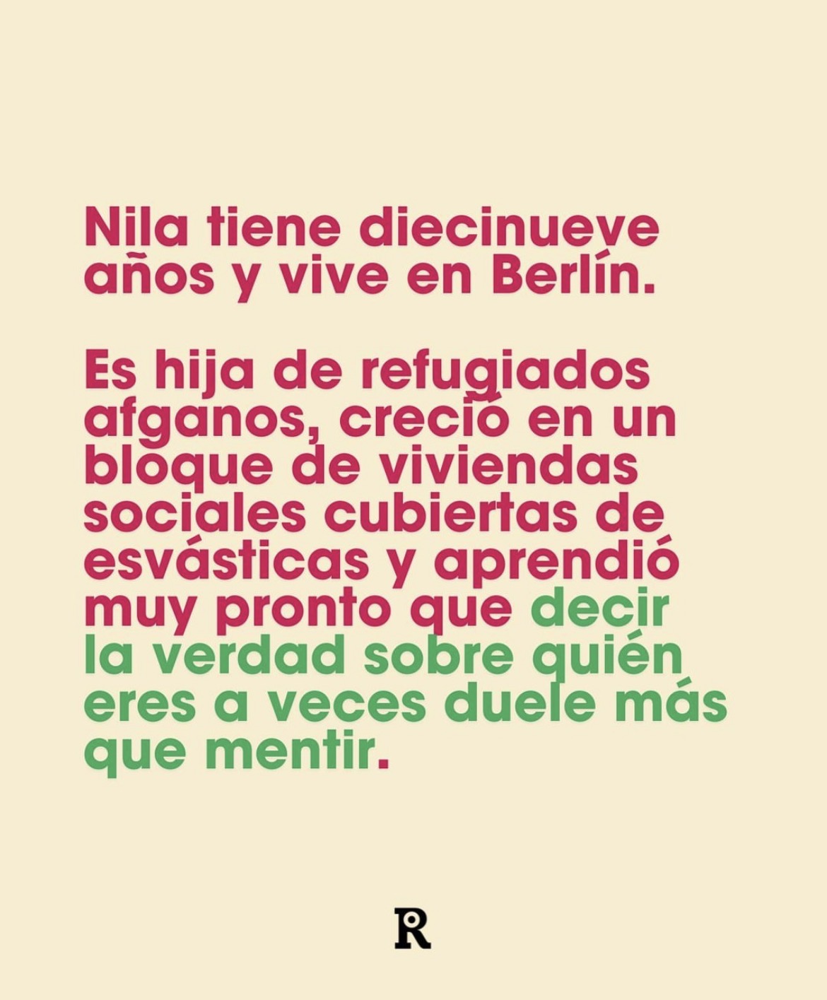 Nilab es una joven alemana de origen afgano que vive en la supuestamente abierta, cosmopolita y postmoderna Berlín. Una ciudad en la que también hay neonazis, por cierto. De ahí que Nilab se pase la vida disimulando. Su piel aceitunada la ‘delata’ y ella prefiere hacerse pasar por griega y mediterránea que ‘confesar’ sus auténticas raíces.