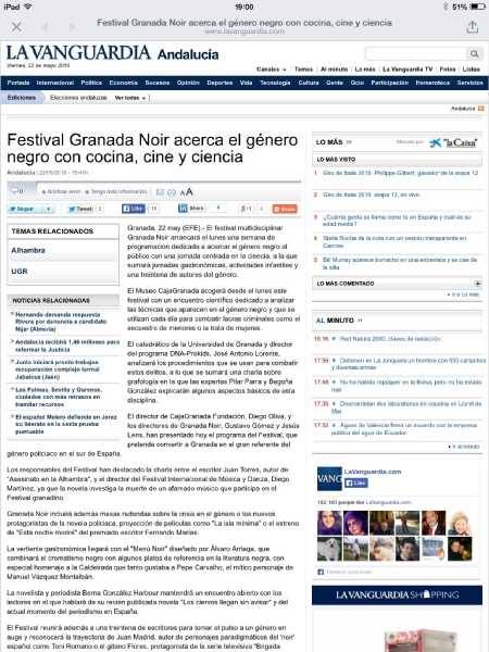 Tenemos la inmensa fortuna de vivir en una tierra que es imán para los creadores. Lo he podido constatar desde el primer momento en que Gustavo Gómez y yo lanzamos Granada Noir, con autores, editores, fotógrafos y lectores que han hecho un ímprobo esfuerzo por venir y acompañarnos. Y que, creo, no se han ido defraudados.
