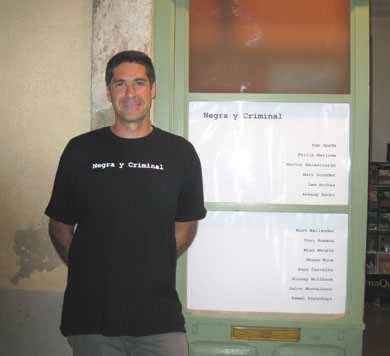 Pero nos quedaba un lugar imprescindible y necesario: la librería Negra y Criminal de la Barceloneta, con nuestros queridos Paco y Montse como anfitriones. Y, como este año teníamos que ir a Cornellá a pasar una semanita jugando al baloncesto, aprovechamos la ocasión para cumplir uno de esos sueños que, por fin se hacen realidad: ponernos la camiseta de Negra y Criminal y posar, como autor, en la puerta de la mítica librería. Un subidón que, quienes me conocen, saben lo fuerte que fue para mí.