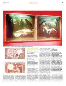 Todo comenzó con el billete de 100 pesetas acuñado en 1953. Me pareció curioso para el despiece que acompañaba el texto principal del reportaje. En el anverso, aquel billete mostraba al propio artista, muy serio y formal. En el reverso se representaba el detalle de uno de sus cuadros: una mujer morena, joven, con los brazos echados sobre un cántaro y un gran sol iluminando la escena.