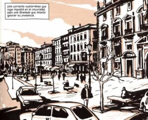 Me encanta la visión de Granada que aparece en ‘La huella de Lorca’, en absoluto ‘bonitiquista’. Las metáforas fluviales y la recuperación de edificios y plazas en espectaculares viñetas. Los paisajes de Víznar y la labor de La Barraca. Y ojo al material extra que trae una nueva edición, imprescindible, de un cómic que ya lo era, imprescindible, desde su aparición, allá por 2011. Fue la primera novela gráfica en acercarse a nuestro universal poeta y no ha perdido un ápice de fuerza o vigencia.