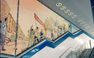 Es puro cómic, noveno arte tamaño XXL y dimensiones colosales que, en una estación, impresiona, anima y enriquece. Como decían los soviéticos sobre el Metro de Moscú, llevarle el arte a la gente y mostrárselo allá por donde transita diariamente.