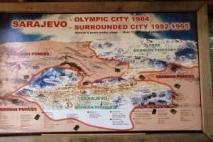 El otro objeto es siniestramente kitsch: un mapa del Sarajevo en el que se celebraron los Juegos de Invierno de 1984, decorado con sus aros olímpicos y con el trazado de las pistas de esquí, la localización de los trampolines de saltos o la villa olímpica. Y, superpuestos a ese escenario idílico… los frentes del Asedio de Sarajevo: los puestos desde los que disparaban los francotiradores, los puntos de abastecimiento del ejército serbiobosnio, tanques y un aterrador etcétera. El paraíso y el infierno dándose la mano.