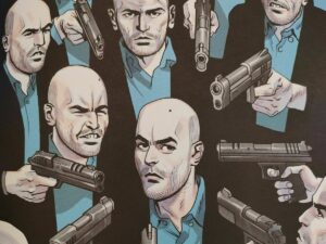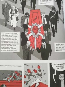 Cuando leí ese texto en una viñeta con un féretro que portaba el cadáver el Roberto Saviano, me quedé helado. Esa imagen está muy al comienzo de la narración. ¡Hay que tener valor para matarte a ti mismo, aunque sea en la ficción!