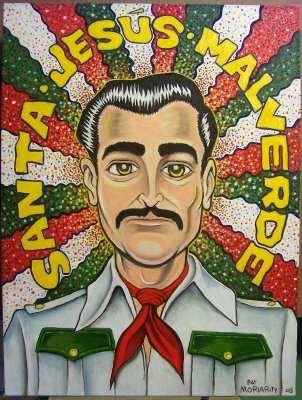 «Todo el mundo en Sinaloa conoce la leyenda de san Jesús Malverde. Era un bandido, un atracador osado, un hombre de los pobres que entregaba el botín a los pobres, un Robin Hood de Sinaloa. Se le acabó la suerte en 1909 y los federales le ahorcaron justo al otro lado de la calle donde ahora se alza su altar.