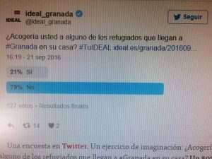 Pero, siendo honesto conmigo mismo: ¿de verdad estaría yo dispuesto a acoger a un refugiado sirio en mi casa? Y la respuesta más probable, como acreditan las conclusiones de la encuesta, es que NO. Al menos, eso ha votado un 80% de los participantes en una consulta cuyos resultados me parecen bastante más creíbles que buena parte de las encuestas electorales cocinadas por los más sesudos expertos demoscópicos de este país (Lean este estupendo artículo de J.E. Cabrero, que lo borda) . De este tema hablo hoy en IDEAL.
