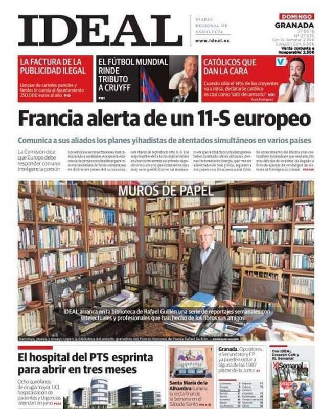 ¡Qué contraste, el de la portada del IDEAL de ayer domingo! Un gran titular, duro y amenazante: “Francia alerta de un 11-S europeo”. Justo debajo, una de las fotos más hermosas que los bibliófilos podemos imaginar: un poeta rodeado por miles de libros, en el estudio de su casa. “Muros de papel”, ha titulado José…