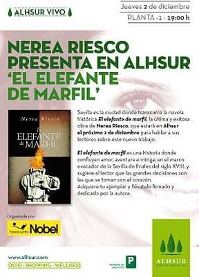 Amigos, hace unas semanas teníamos a la escritora Nerea Riesco en Granada. No fuimos muchos, pero pudimos disfrutar de una amena charla muy ilustrativa, divertida e informativa. El día 2 de diciembre, jueves, Nerea vuelve a nuestra tierra, a presentar su maravillosa novela «El elefante de marfil». Será en el Centro Comercial Alhsur, en el…