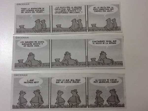 Me gusta Orceman, de Carlos Hernández, por su existencialismo. Por su radical y serena descripción de la esencia del ser humano, desde un punto de vista netamente marxista: partiendo de la nada hemos alcanzado las más altas cotas de miseria. Y seguimos perseverando. Con ahínco. Sirvan estas tres tiras como ejemplo: Orceman es un soplo…