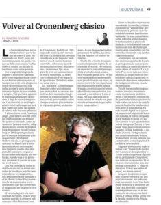 Llegados a este punto, dudo si volver a ver ‘Vinieron de dentro de’, ‘La mosca’, ‘Inseparables’ o ‘Crash’ o si entregarme a algunas de las películas de Cronenberg que no vi en su momento: ‘El almuerzo desnudo’ y las más modernas ‘Cosmopolis’ o ‘Maps to the stars’. Cintas que, sobre el papel, me atraen menos.